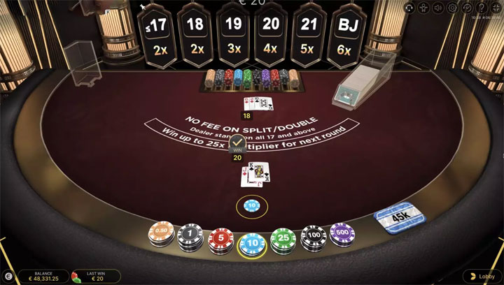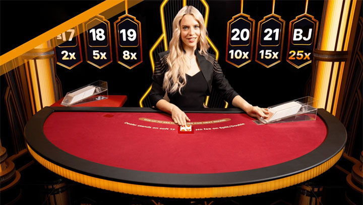 สิ่งที่ทำให้ Blackjack เป็น เกมไพ่ยอดนิยม ไม่ใช่แค่ชื่อเสียงของ Evolution Gaming แต่เป็นฟีเจอร์ที่ออกแบบมาอย่างชาญฉลาด โดยเฉพาะ Lightning Multipliers ซึ่งเป็นหัวใจของเกม หลังจากดีลไพ่ ผู้เล่นจะเห็น “ฟ้าผ่า” สุ่มการ์ด 5 ใบพร้อมตัวคูณ 2x-25x หากไพ่ของคุณตรงกับการ์ดที่ถูกสุ่ม คุณจะได้ตัวคูณนั้นทันที แต่ต้องจ่าย Lightning Fee เพิ่ม (ปกติ 20% ของเดิมพัน) เพื่อเข้าร่วม ซึ่งทำให้ RTP รวมอยู่ที่ประมาณ 82.4% แต่เมื่อชนะ มันชดเชยได้หลายเท่า