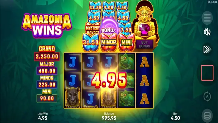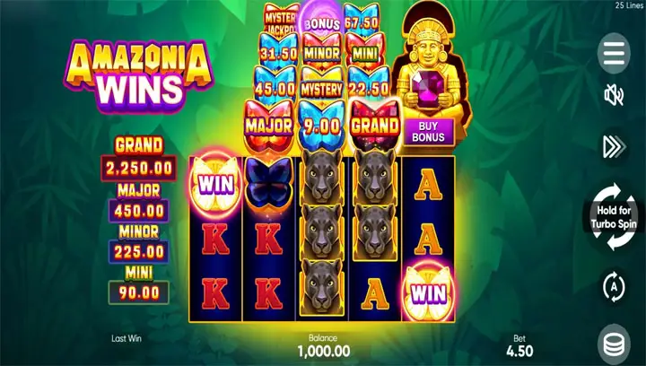 Amazonia Wins ใช้โครงสร้างแบบคลาสสิก 5 วงล้อ 3 แถว 25 เพย์ไลน์ ซึ่งเป็นรูปแบบที่คุ้นเคยและเล่นง่ายสำหรับผู้เล่นทุกวัย ธีมหลักคือ ป่าอเมซอนมหัศจรรย์ พื้นหลังเป็นป่าดิบชื้นเขียวขจี มีต้นไม้ใหญ่เถาวัลย์พันรอบ หมอกบางๆ ลอยคลุ้ง และแสงแดดสาดส่องผ่านใบไม้สร้างบรรยากาศลึกลับแต่สวยงาม