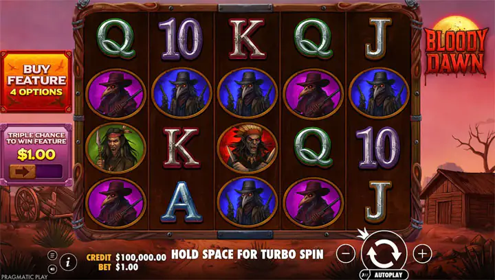 สล็อต Bloody Dawn จาก Pragmatic Play นำเสนอธีมที่ไม่เหมือนใคร โดยผสมผสานบรรยากาศของ Wild West หรือป่าตะวันตกแบบคลาสสิกเข้ากับองค์ประกอบสยองขวัญแบบซอมบี้และสัตว์ประหลาด ทำให้เกมนี้กลายเป็น รุ่งอรุณนองเลือด อย่างแท้จริง ผู้เล่นจะถูกพาไปยังเมืองร้างในทะเลทรายที่ปกคลุมไปด้วยหมอกเลือดและแสงรุ่งอรุณสีแดงฉาน สัญลักษณ์บนวงล้อประกอบด้วยตัวละครคาวบอยซอมบี้ มอนสเตอร์หมาป่า และสิ่งมีชีวิตแปลกประหลาดที่ดูเหมือนหลุดมาจากนิยายสยองขวัญผสม cowboy