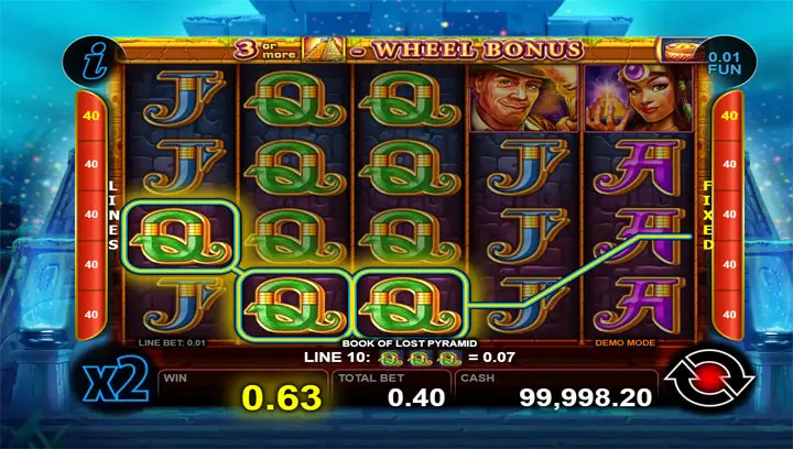 เมื่อกดเข้าไปเล่น Book of Lost Pyramid คุณจะรู้สึกเหมือนกำลังสำรวจพีระมิดจริง ๆ พื้นหลังเป็นทะเลทรายสีทองอร่ามภายใต้แสงอาทิตย์ยามเย็น พีระมิดยักษ์ใหญ่ตั้งตระหง่าน มีเสาโบราณแกะสลักลวดลายฮิโรกลิฟฟิค สัญลักษณ์บนรีลประกอบด้วย: