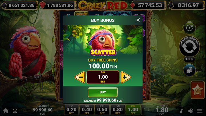 Scatter (Red Parrot): นกแก้วแดงสุดบ้าคลั่ง ปรากฏ 4 ตัวขึ้นไปเพื่อเข้าสู่โหมด Free Spins