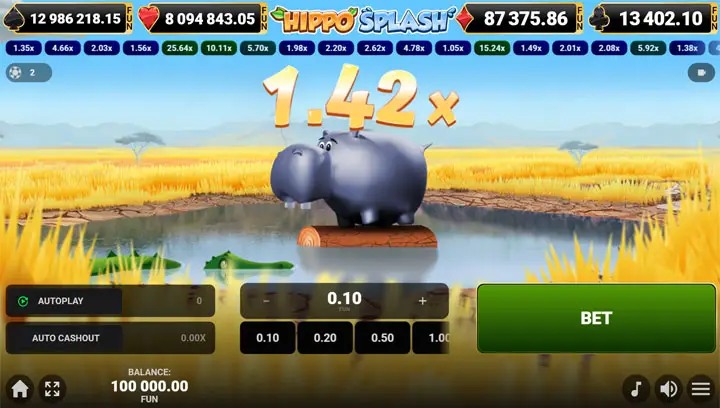 Hippo Splash มาพร้อมคุณสมบัติที่ทำให้เกมนี้แตกต่างจากเกม Crash ทั่วไป เริ่มจากกลไกหลักคือการเพิ่มตัวคูณแบบเรียลไทม์ ผู้เล่นวางเดิมพันก่อนรอบเริ่ม แล้วดูฮิปโปก้าวเดินบนท่อนไม้ ตัวคูณจะเพิ่มขึ้นเรื่อยๆ จนกว่าฮิปโปจะพลัดตกน้ำ ซึ่งเป็นจุด “Crash” ที่ทำให้เสียเดิมพันทั้งหมดหากไม่ cash out ทันเวลา