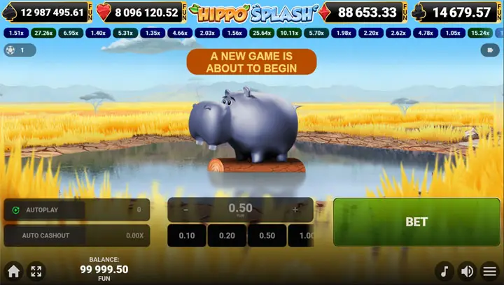สล็อต Hippo Splash หรือที่แฟนๆ ชาวไทยเรียกกันติดปากว่า ฮิปโปพ่นน้ำ เกมนี้ไม่ใช่สล็อตแบบดั้งเดิมที่หมุนรีลทั่วไป แต่เป็นเกมประเภท Crash Game ที่ผสมผสานความสนุกสนานเข้ากับความตึงเครียดแบบเรียลไทม์ ทำให้ผู้เล่นรู้สึกเหมือนกำลังผจญภัยไปกับฮิปโปตัวน้อยที่กำลังทรงตัวบนท่อนไม้กลางบ่อน้ำ ด้วยธีมที่สดใส น่ารัก และเต็มไปด้วยโอกาสในการ “แตก” หรือชนะรางวัลใหญ่แบบกระจายทั้งบ่อ เกมนี้ถูกออกแบบมาเพื่อดึงดูดผู้เล่นทุกวัย ไม่ว่าจะเป็นมือใหม่ที่อยากลองเล่นเกมง่ายๆ หรือมือโปรที่มองหาความท้าทายในเรื่องของจังหวะและกลยุทธ์